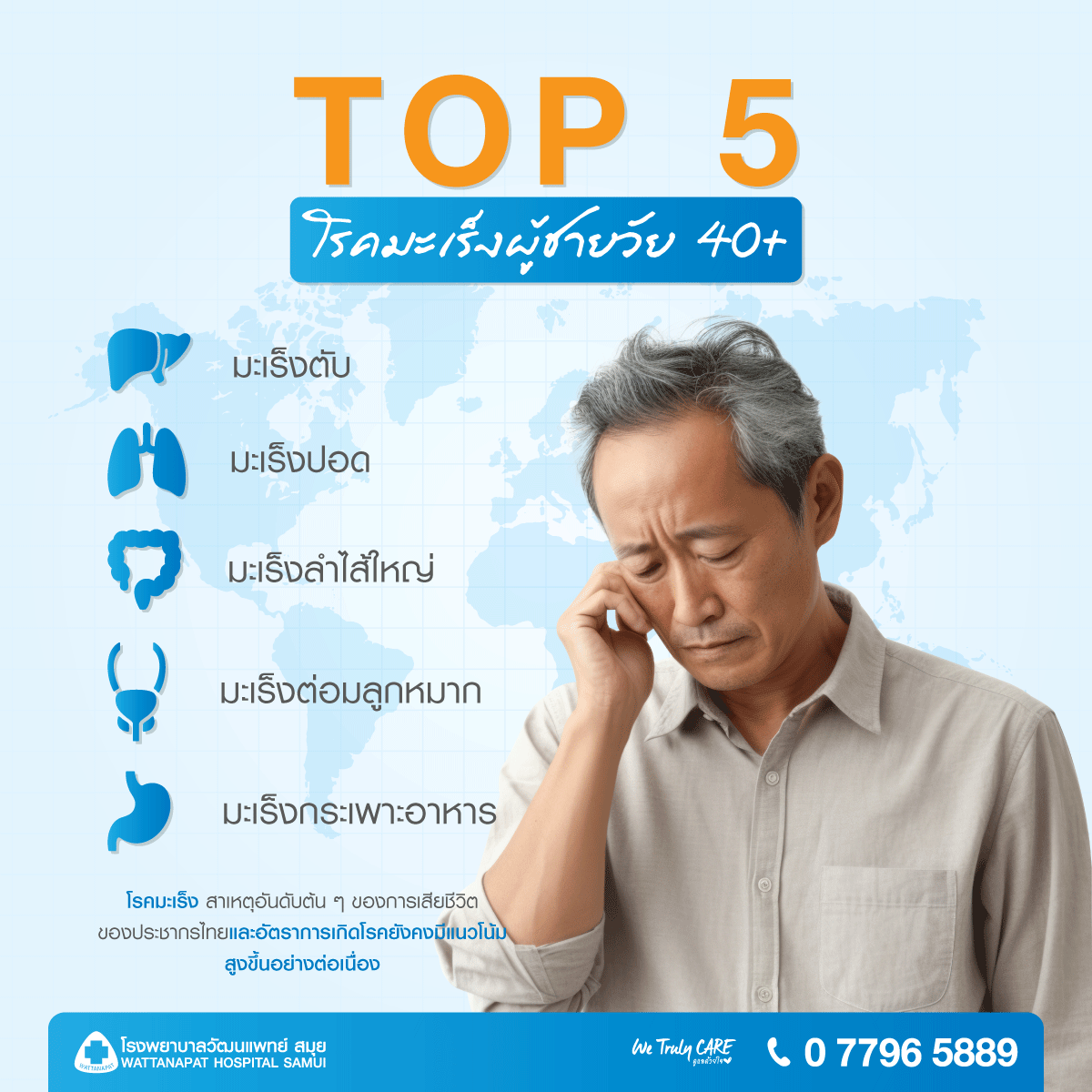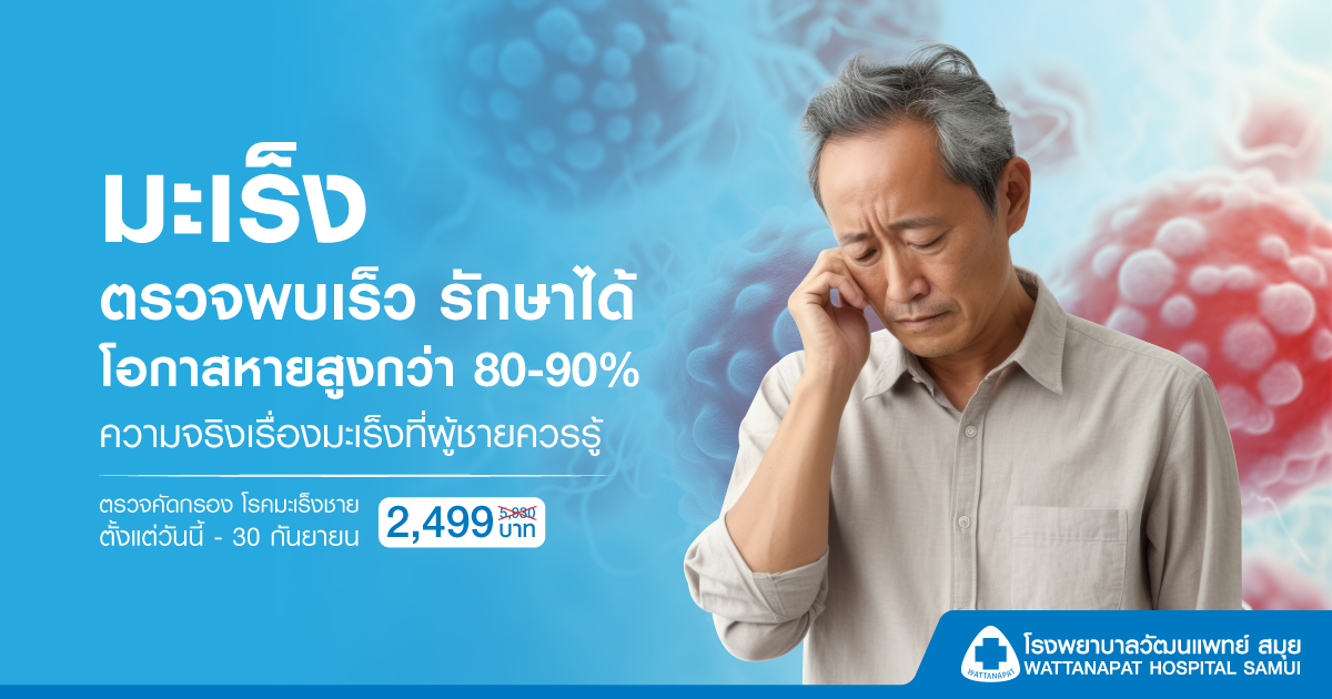 ตรวจพบเร็ว ..รักษาได้ คุณผู้ชายทุกคนควรใส่ใจสุขภาพของตัวเอง หมั่นตรวจสุขภาพประจำปี และปรึกษาแพทย์เมื่อพบอาการผิดปกติ เพราะการละเลยอาจทำให้โรคเล็กน้อยกลายเป็นมะเร็งระยะลุกลามได้ โรงพยาบาลวัฒนแพทย์สมุย พร้อมด้วยทีมแพทย์ผู้เชี่ยวชาญและเทคโนโลยีการตรวจที่ทันสมัย พร้อมดูแลและให้คำปรึกษาอย่างครบวงจร