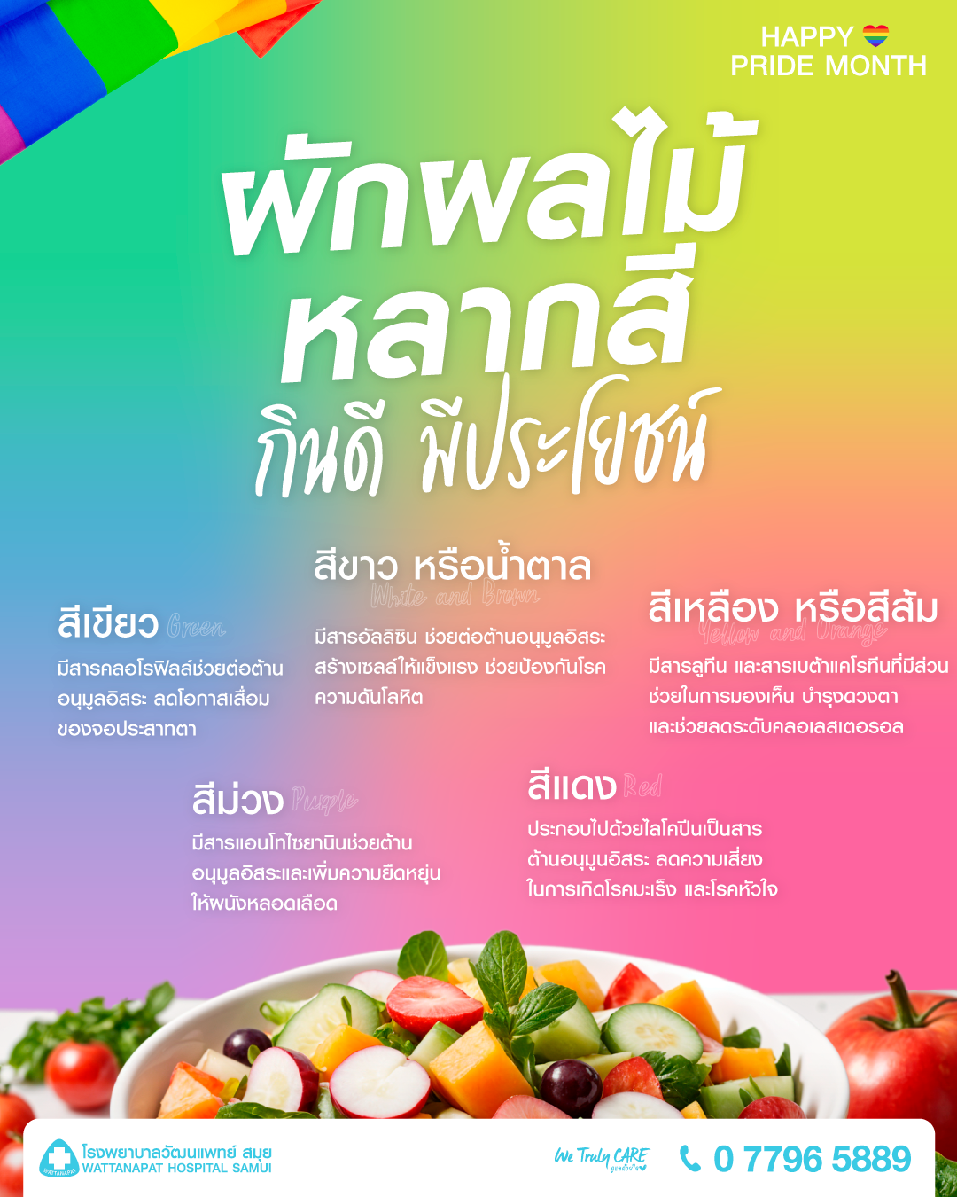 ผักผลไม้ หลากสี ประโยชน์ที่คุณไม่ควรมองข้าม ประโยชน์ของผักผลไม้มีมากมาย แต่การทานตามสี หรือ Rainbow Diet เป็นการเน้นบริโภคผักผลไม้ 7 สี เพื่อให้ได้ครบทั้ง วิตามิน เกลือแร่ สารต้านอนุมูลอิสระ เป็นอีกหนึ่งเคล็ดลับการเลือกทานผัก ผลไม้ที่ดี ที่สามารถเอาไปปรับใช้ในชีวิตประจำวันได้